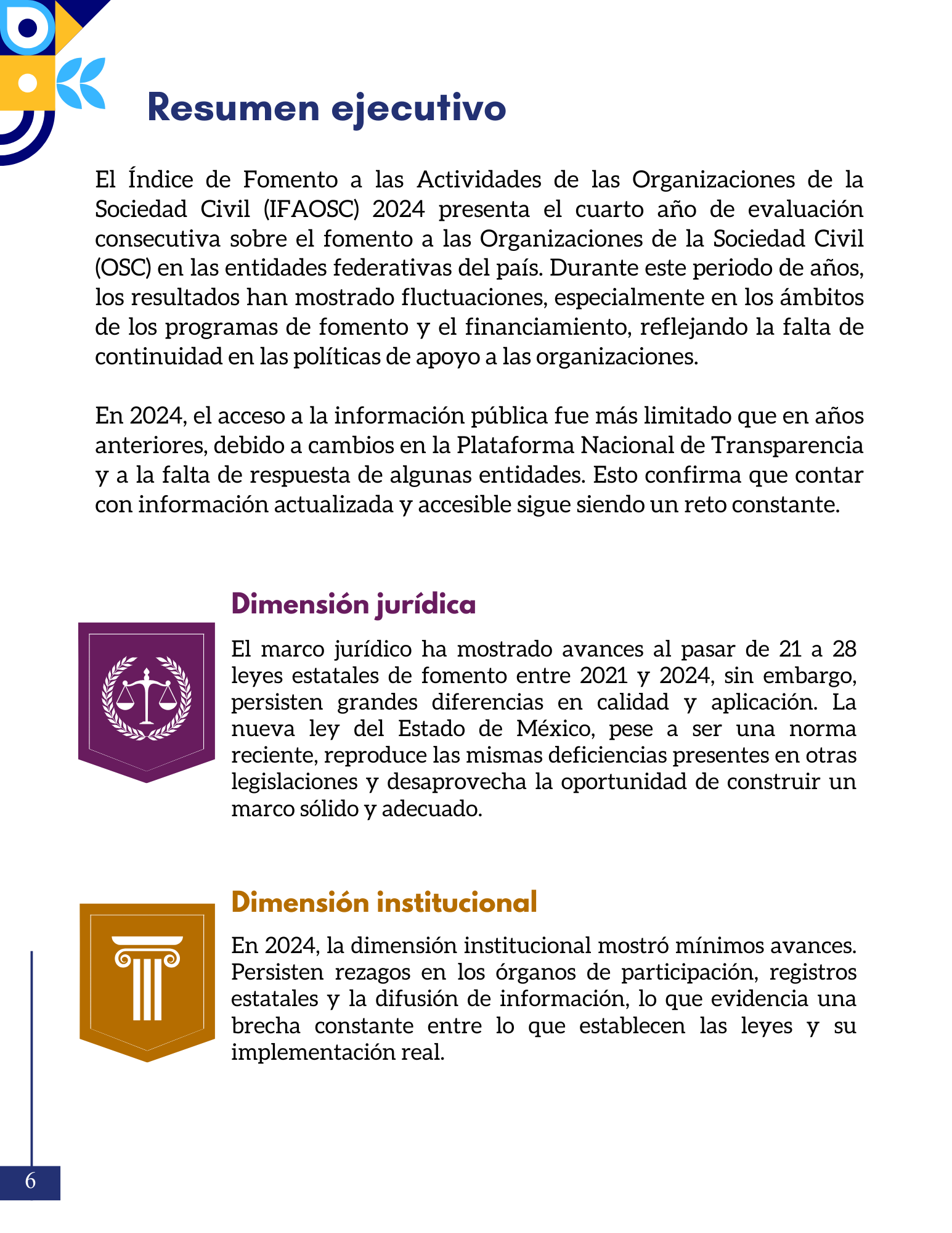 Presenta el objetivo del reporte del IFAOSC 2024 y ofrece un panorama del fomento a las OSC en los tres marcos analizados: jurídico, institucional y programático.